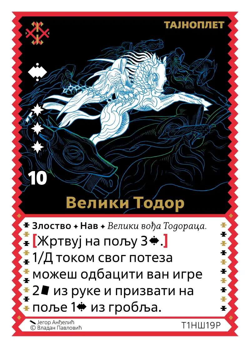 [Жртвуј на пољу 3 Нав бића.] Једанпут по двобоју током свог потеза можеш одбацити у заборав 2 карте из руке и призвати на поље 1 Нав биће из гробља.